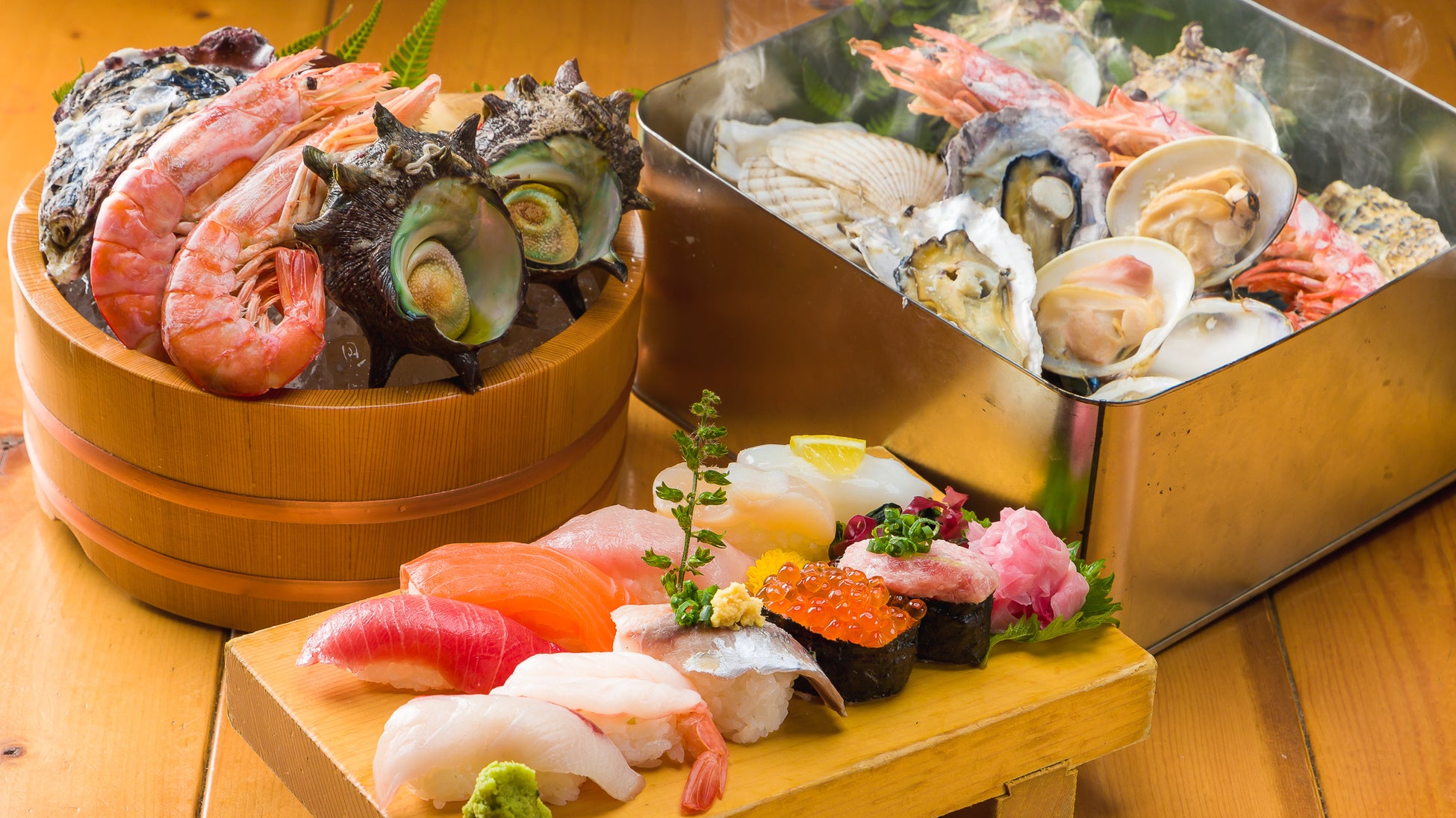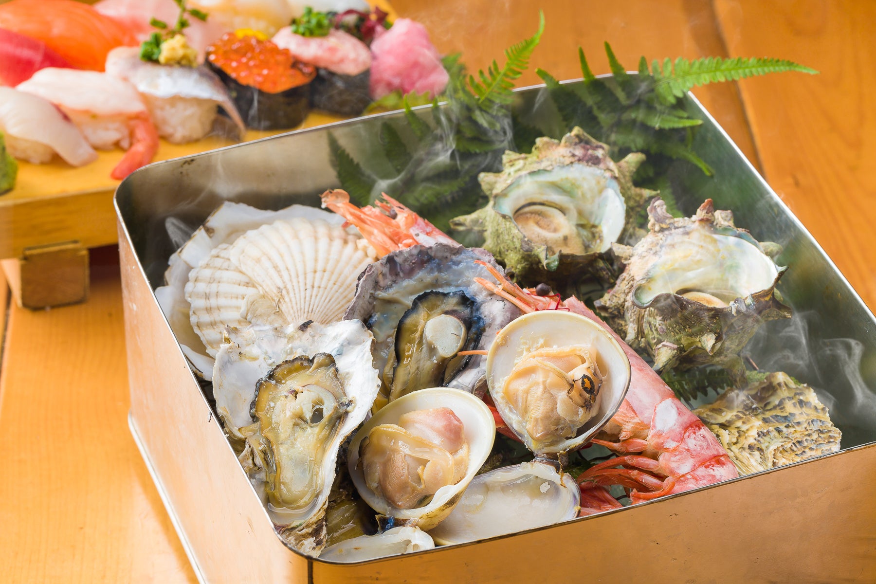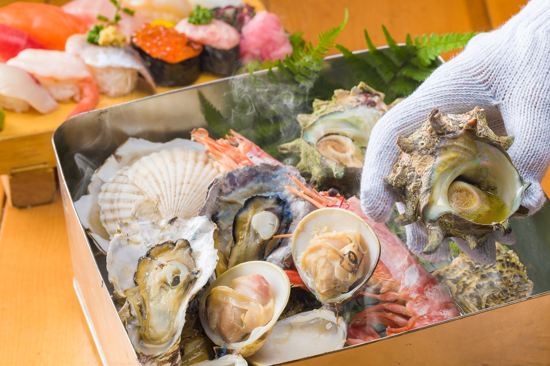 サザエ、エビ、牡蠣、大粒ハマグリ、ホタテ