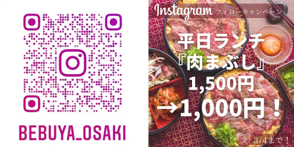株式会社Globridge(グロブリッジ、本社:東京都港区赤坂、代表取締役:大塚 誠)の運営する『タンとレモンサワー 焼肉 べぶや 大崎店』は、2022年3月4(金)までの期間中、Instagramフォローキャンペーンを実施いたします。店舗アカウントをフォローしている方限定で、通常価格1,500円(税込)の肉まぶし定食を1,000円(税込)で提供いたします。