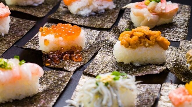 コハダ酢〆、〆さば、〆さば炙り、炙りサーモン、えんがわ、漬けまぐろ、びんちょうまぐろ、塩炙りびんちょう、塩炙りえんがわ、あなご、さより、いわし、シーザーオニオンサーモン、炙りチーズサーモン、えびバジルチーズ、とろ炙り、漬けマグロ、天然ふぐ、キス、うなぎ