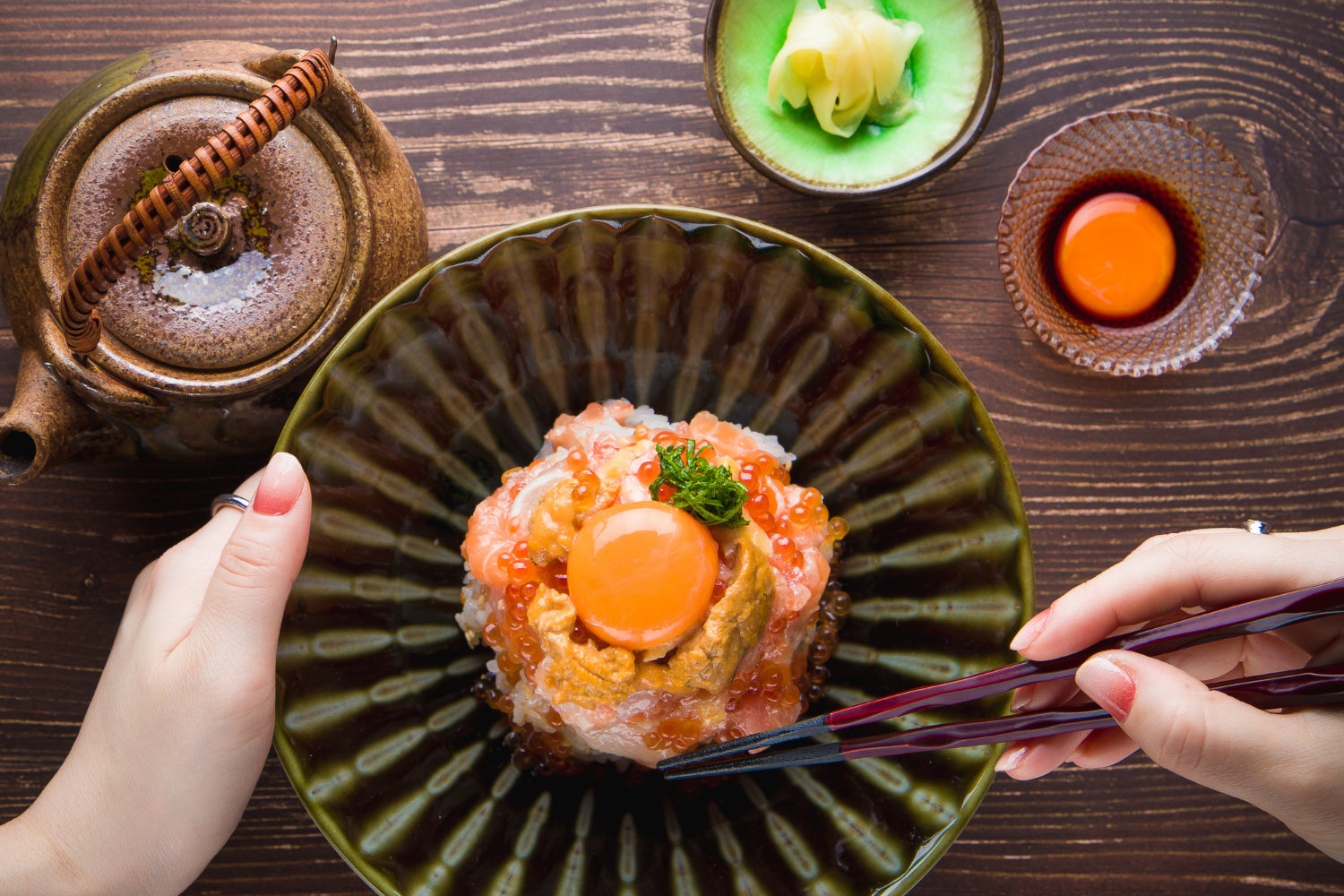また、味変で3度楽しめることも魅力のひとつです。まずはそのままお召し上がりいただき、続いてたまごを絡めて全体をまろやかに。最後は特製のお出汁をかけて「海鮮出汁茶漬け」で〆てください!わさびや薬味もお好みで。