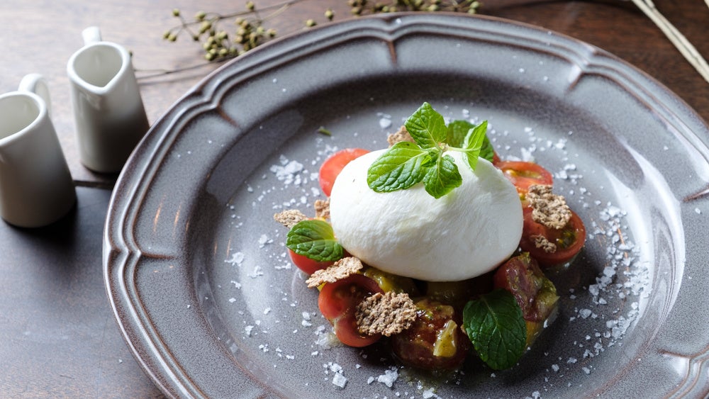 ブッラータは、一見モッツァレラチーズのようですが中にはクリーム状にしたチーズソースがぎっしりと詰まっており、ナイフを入れるとそのクリームが溢れ出します。濃厚なミルクの旨味と、チーズの爽やかな味わいを味わえるフレッシュチーズとして、チーズ好きの中でもファンの多い種類のひとつです。チーズチーズカフェでは、そんなブッラータの魅力を最大限楽しんでもらうため、カプレーゼ風に仕上げました。