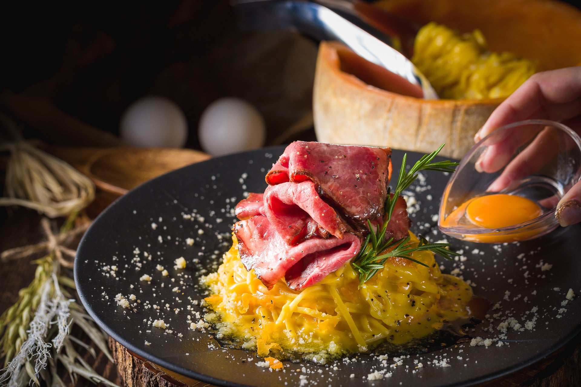 - 贅沢すぎる!肉盛り×ミモレットチーズの器で仕上げる濃厚カルボナーラ