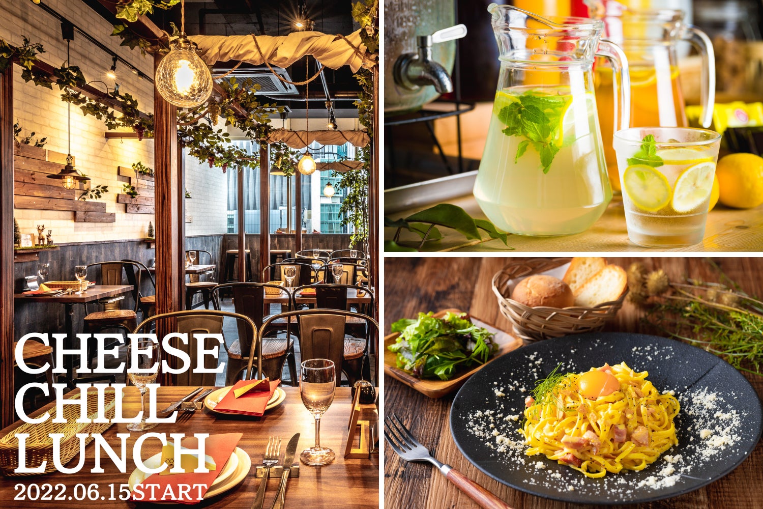 今回のリニューアルでは、ランチタイムは都会の喧騒を離れてゆったりと過ごして欲しいという想いから、テーマを「CHEESE CHILL LUNCH」とし、自慢のチーズをたっぷり使用したパスタやハンバーググリルに加え、ハーブティーなどが楽しめるドリンクバーコーナーを用意いたしました。都心でゆったり”チルい”ランチタイムをお過ごしください。