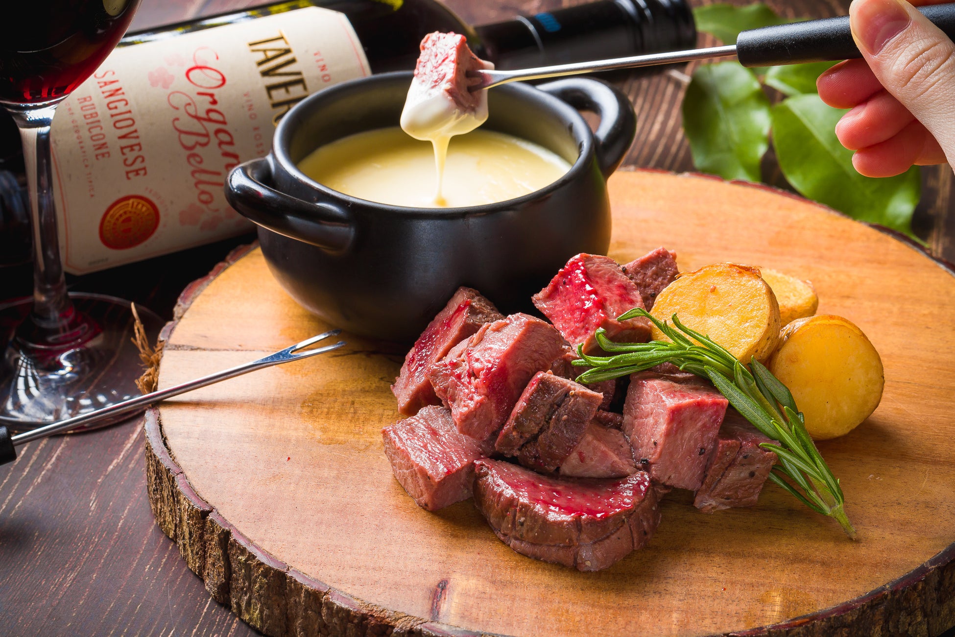 今回は、チーズとの相性を考え、赤身が多くやわらかな牛肩ロース「ざぶとん」の部位を使用いたしました。じっくり時間をかけながら火を通し極上のタリアータステーキに仕上げた「ざぶとん」は、豪快に大きめにカット。それをラクレットチーズブレンドの特製チーズフォンデュソースにくぐらせて食べる贅沢すぎるお肉のチーズフォンデュを、是非ご堪能ください。