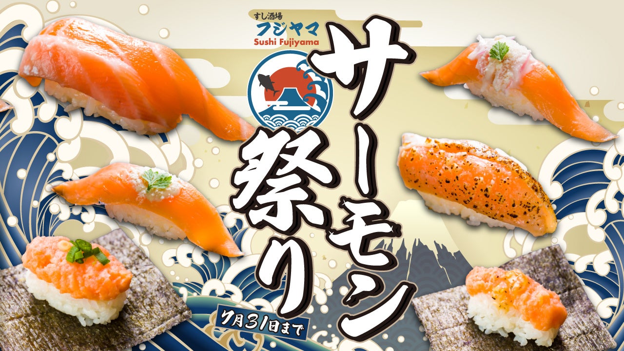 SNSやメディアで話題の”寿司食べ放題”が楽しめる『すし酒場 フジヤマ』秋葉原店は、2022年7月15日(金)~31日(日)の期間限定で、食べ放題で楽しむ「サーモン祭り」を開催いたします。今回の「サーモン祭り」では、コースで楽しむお寿司食べ放題のラインナップに、サーモン寿司を6種ご用意いたしました。老若男女問わず人気のサーモンを、様々な味わいで好きなだけお楽しみください。