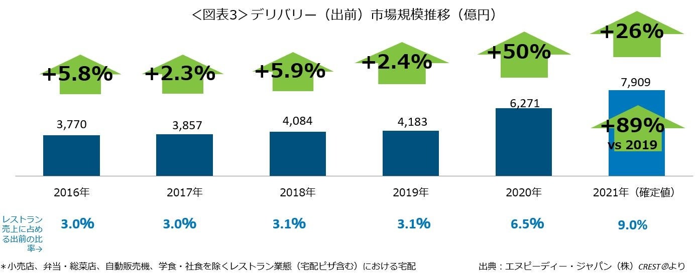 フードデリバリーサービスの市場規模は、2016年から右肩上がりで成⻑しており、コロナ禍の2020年に急成長をしたのちも順調に拡大を進めています。また、その間に市場改変も進み、取り扱う商品も「レストラン商品」「コンビニエンスストア商品」「ドラッグストア商品」とますます幅を広げ、市場成⻑スピードは業界内外で注⽬を浴びております。
