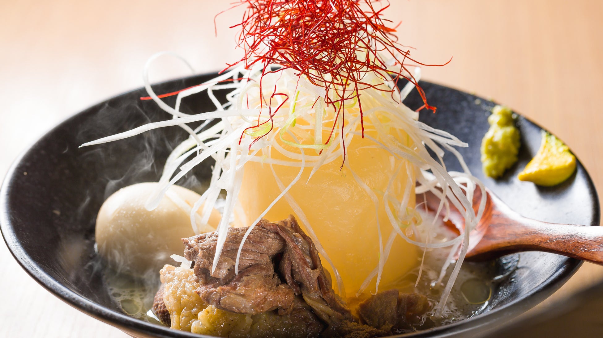 秘伝の牛骨スープをベースにしたゴエモンオリジナルの牛出汁は、白濁したスープに凝縮された旨味と甘味が体に染み渡ります。大ぶりの大根、牛すじ、たまごのシンプルな構成ながら、牛骨の白濁したこってりしたスープが新鮮な新感覚おでん。柚子胡椒や七味など薬味と一緒にお召し上がりください。
