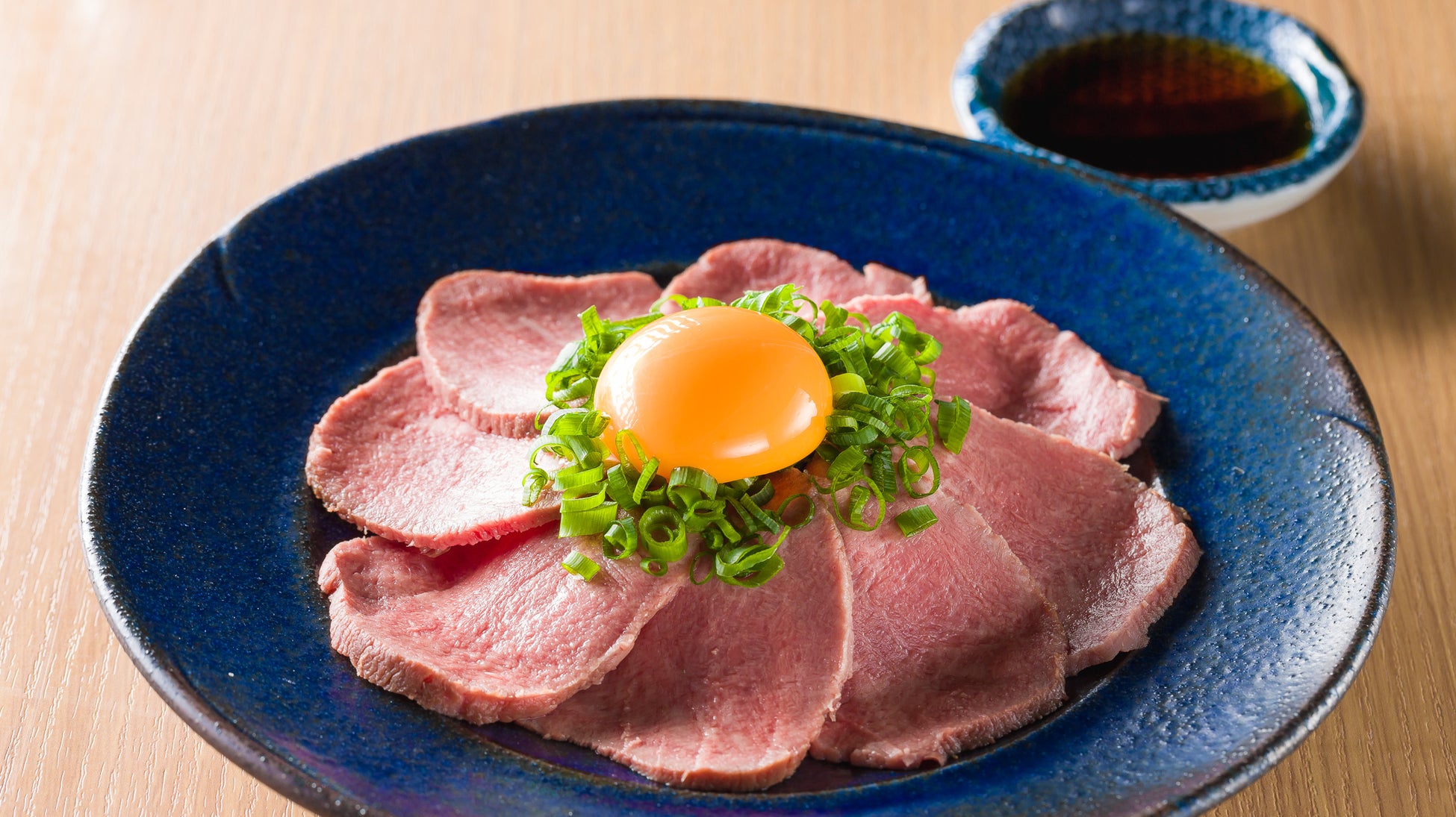 大判の牛タンを、たっぷりネギと卵黄にて食べる絶品牛タン刺し。こだわりの特製だれとたまご、牛タンとネギの相性は抜群です。