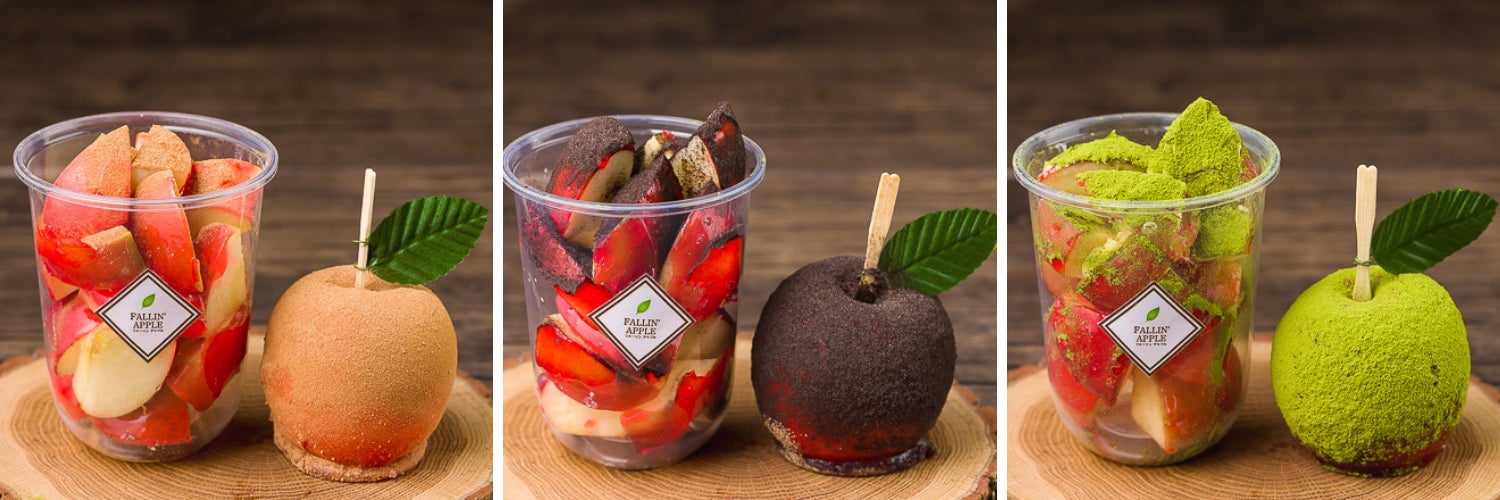 王道の「真っ赤なりんごあめ」の他にも、フレーバーりんごあめを4種類ご用意しております。王道にトライした後は、お好みのフレーバーを見つけてみるのはいかがでしょうか?