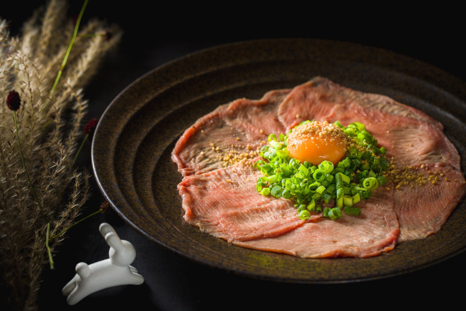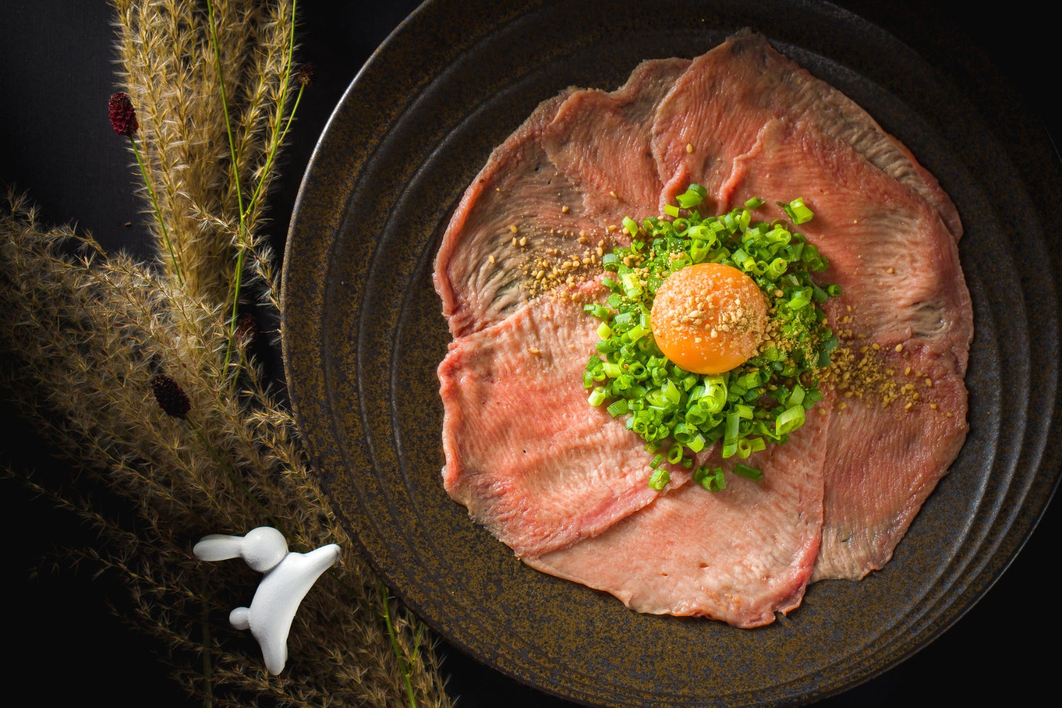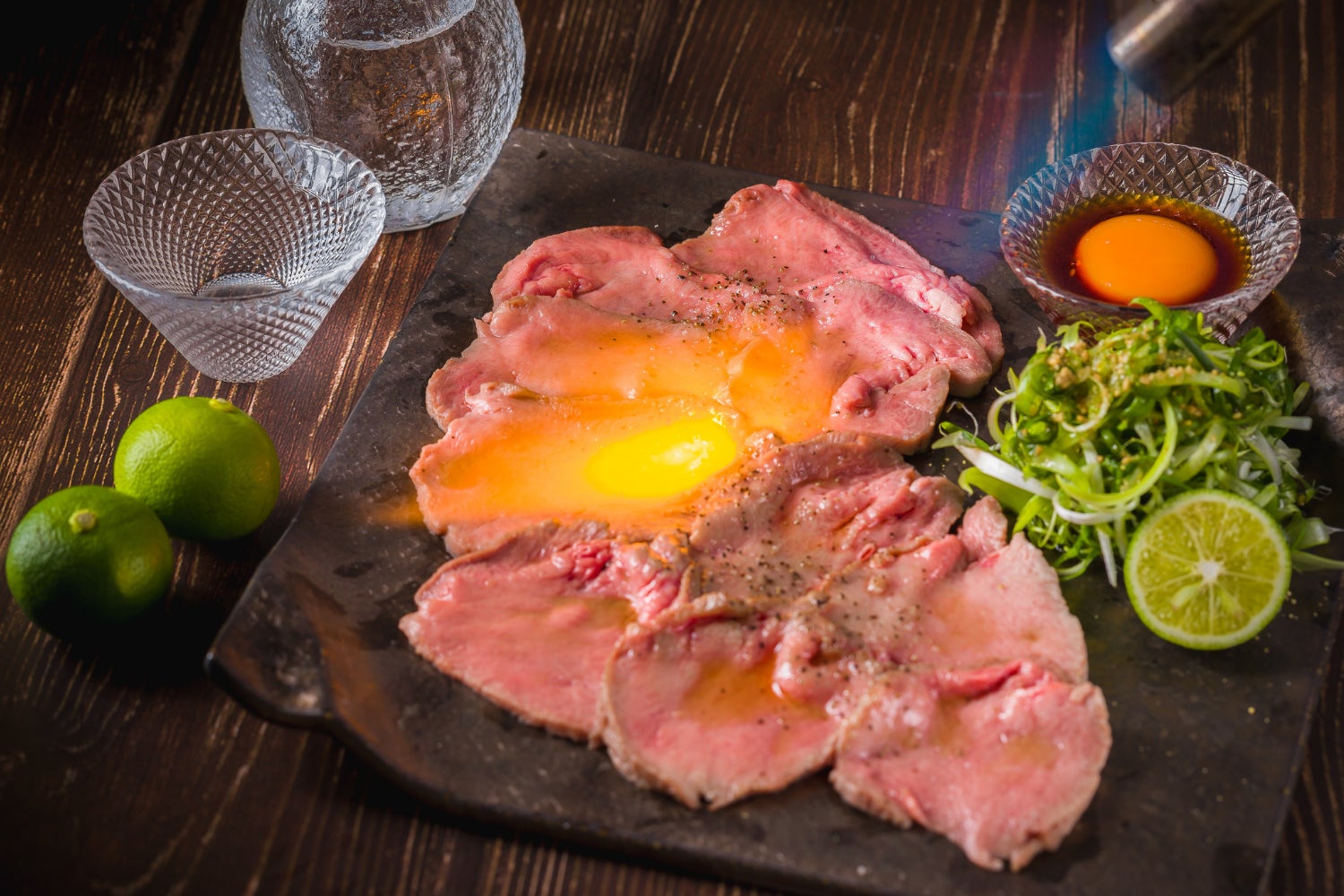 - 一度食べればやみつきに!お月見たまごを絡めて食べる牛タン刺しが100円!