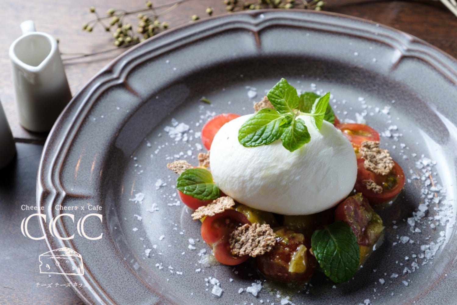 ブッラータは、一見モッツァレラチーズのようですが中にはクリーム状にしたチーズソースがぎっしりと詰まっており、ナイフを入れるとそのクリームが溢れ出します。濃厚なミルクの旨味と、チーズの爽やかな味わいを味わえるフレッシュチーズとして、チーズ好きの中でもファンの多い種類のひとつです。チーズチーズカフェでは、そんなブッラータの魅力を最大限楽しんでもらうため、カプレーゼ風に仕上げました。
