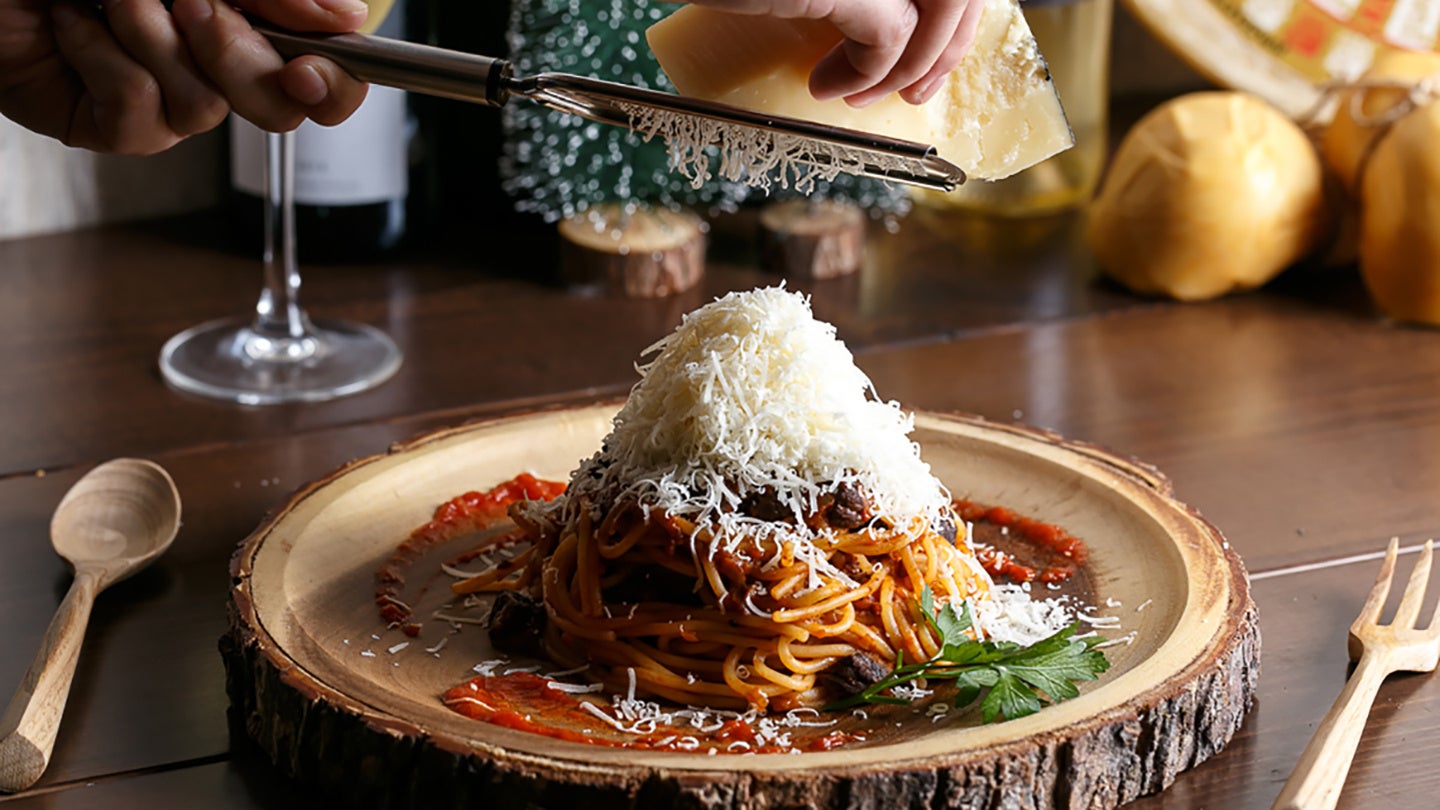 ■肉の旨味が凝縮された自慢のボロネーゼの上にイタリア伝統のハードチーズ「ベラ・ロディ」をこれでもかというほどかけ続けます。ゴツゴツしたボロネーゼ山の岩肌を覆うふわふわの粉雪チーズの絶景は必見です。