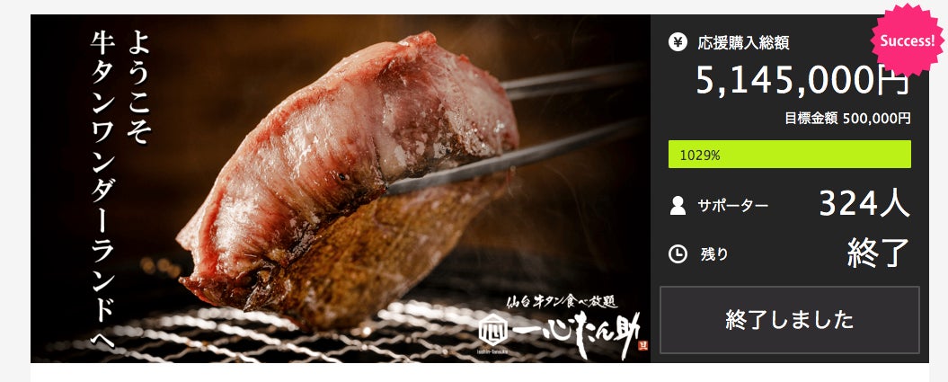 『一心たん助 旦‐dan- 有楽町店』のオープンに伴い、クラウドファンディング「Makuake」でMakuake限定の特別な食べ放題コースを販売した際には、目標金額50万円に対し500万円以上の応援購入をいただき、成功率924%という大成功を収めました。