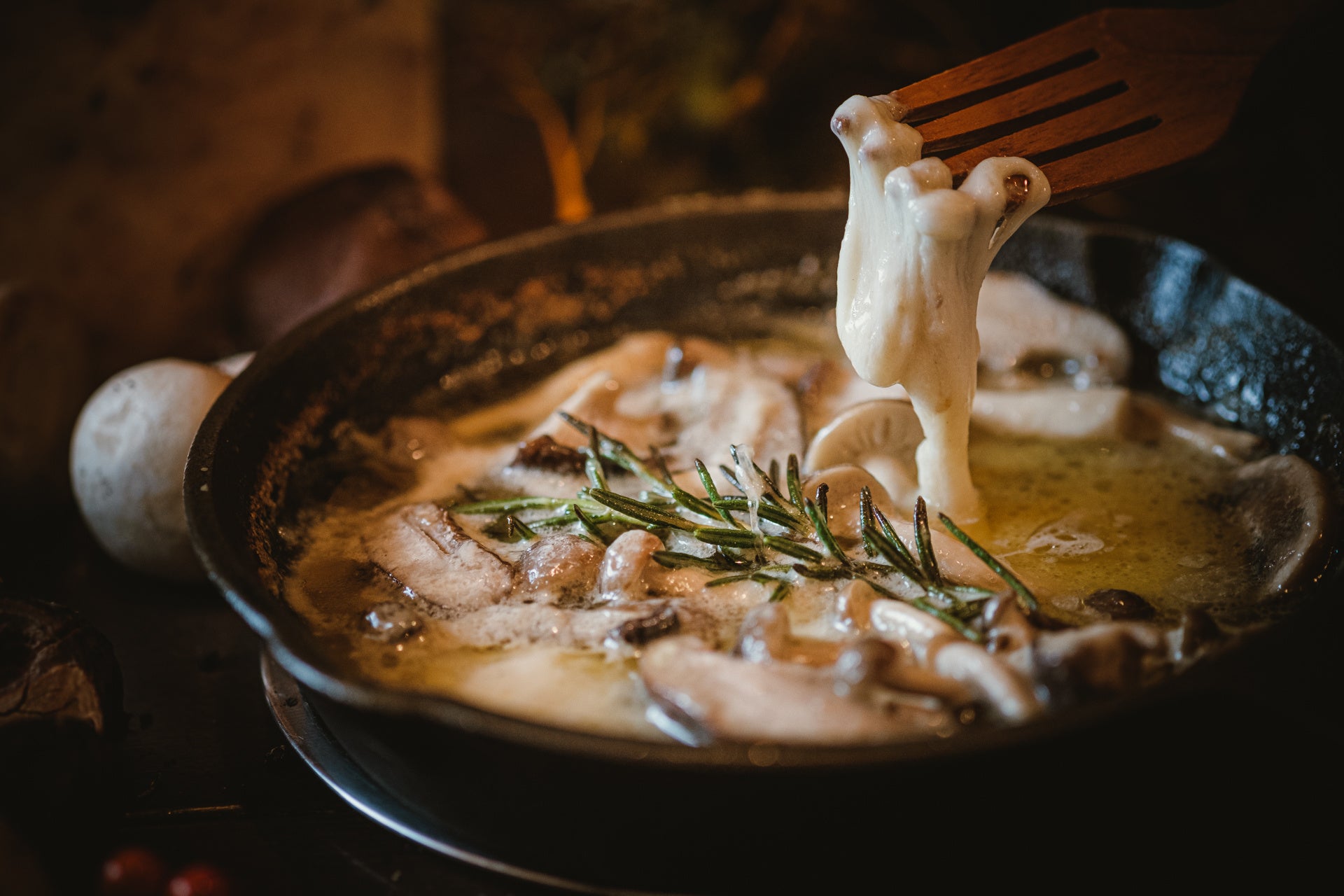 当店のメニューの中でも根強い人気の「きのことチーズのミルクアヒージョ」は、一般的なアヒージョのイメージに反して、生クリームベースの「特製アヒージョオイル」に、フレッシュチーズの代名詞モッツァレラチーズを使用を使用した“白いアヒージョ”です。クセが少なく、独特の弾力が特徴のモッツァレラチーズは熱を入れることで旨みと粘度が増し、とろ〜りとした食感がお楽しみ頂けます。