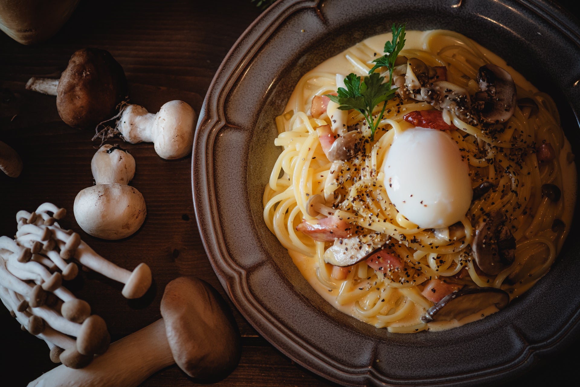 クリーミーなカルボナーラには風味豊かな3種類のきのこ(まいたけ、エリンギ、しめじ)を使用しており、ミモレットチーズを絡めて濃厚に仕上がったもちもちのパスタは、一度食べればやみつきに。きのこの香りとミモレットチーズの旨みがマッチした濃厚カルボナーラは、この秋必ず食べていただきたい逸品です。