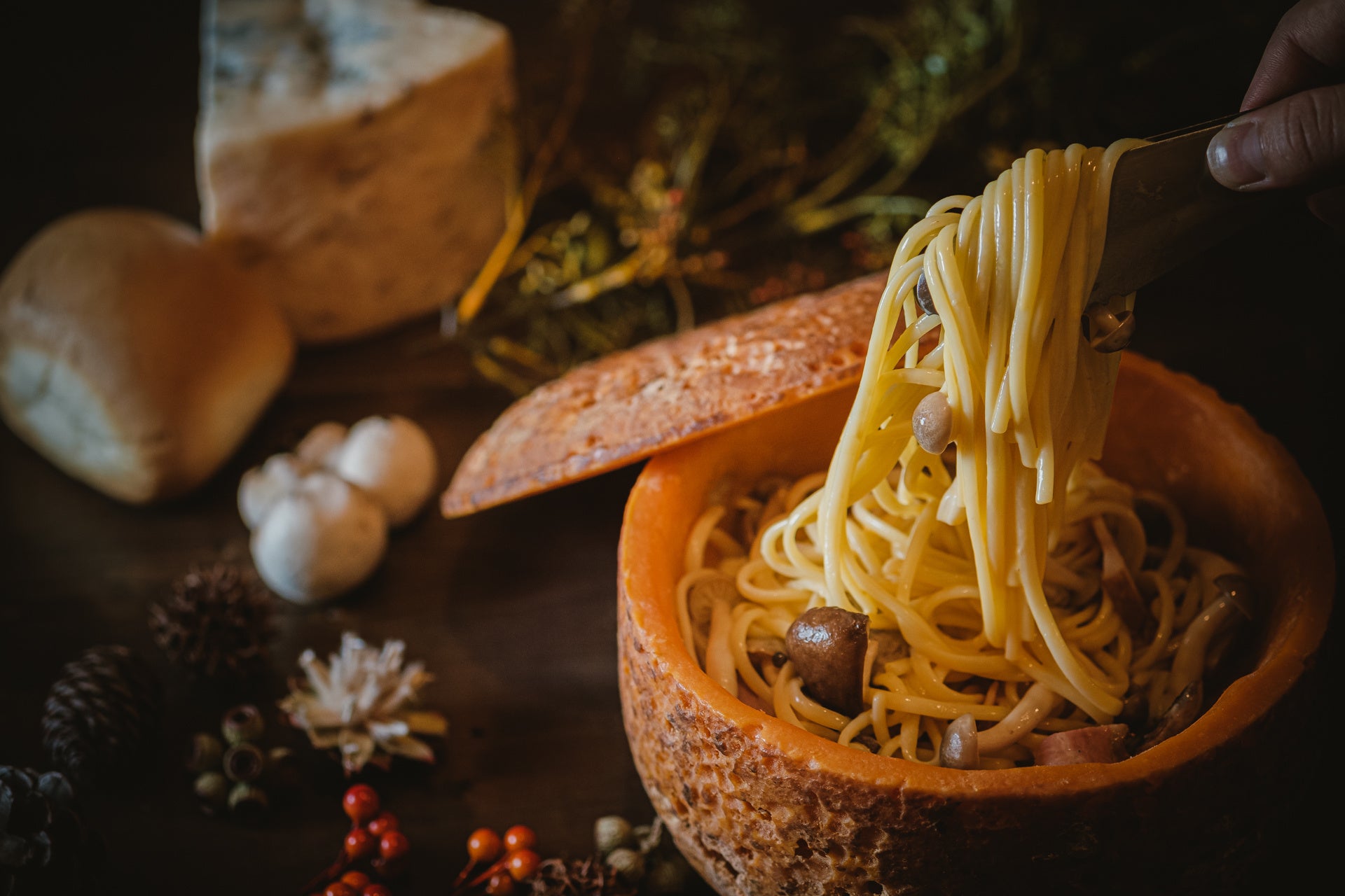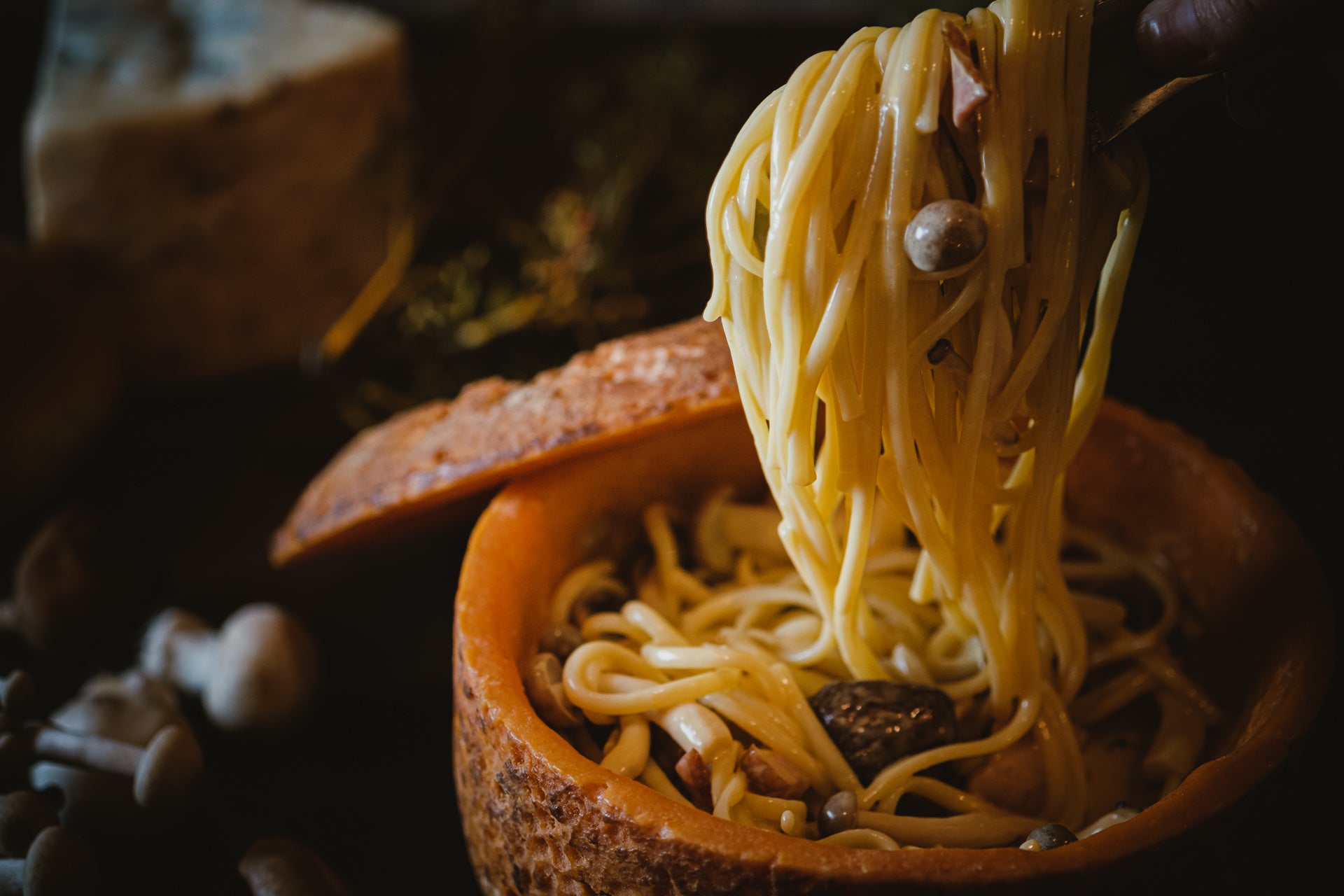 - ミモレットチーズの器で仕上げる濃厚カルボナーラ