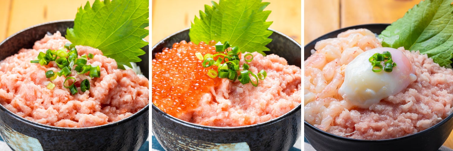 ・【ネギトロ・甘エビ・サーモンたたき】 とろける温玉3色丼 1,290円~ (写真・右)