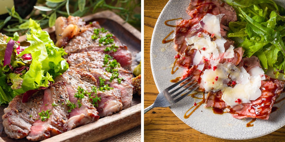当店のサーロインは、筋肉が少なく、柔らかさと程よい弾力を兼ね備えたストリップロインを使用しているため、噛んだ瞬間に肉の旨味と脂の甘味、芳醇な香りが一気に口の中に広がります。シンプルにステーキで頂くのもおすすめですが、ぜひ試していただきたいのが「タリアータ」。サーロインステーキを薄く切って皿に盛りつけ、削ったパルミジャーノレッジャーノと一緒に食べる贅沢な一皿はワインとの相性も抜群です。