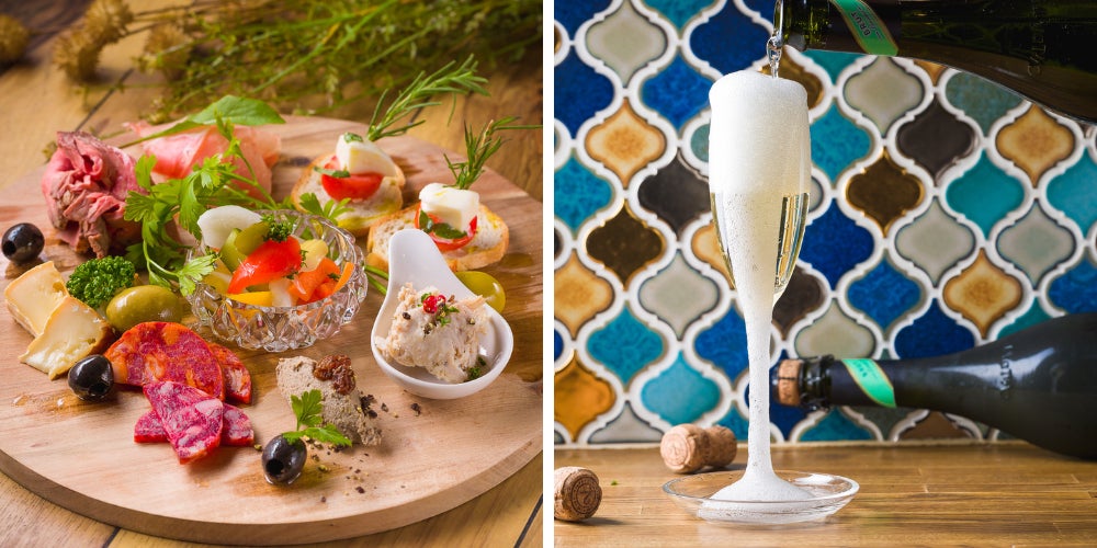 - 前菜は名物【なみなみスパークリングワイン】と一緒に