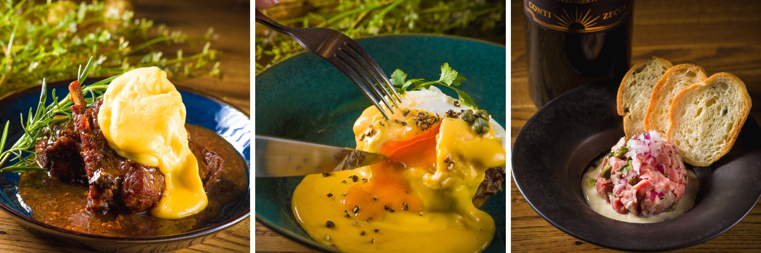 【写真中央】厚切り牛タンのエッグベネディクト 1,980円(税込)