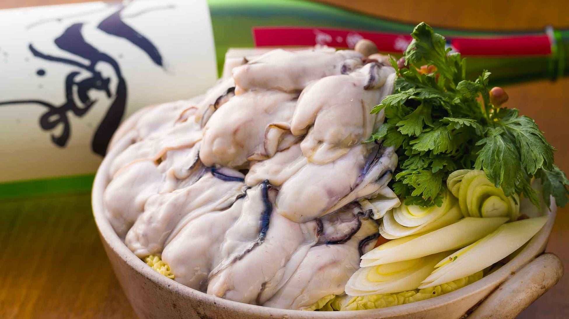 春が食べごろの大粒の牡蠣を溢れんばかりに使用した牡蠣鍋は、“フジヤマ”さながらの大迫力。見た目のインパクトはさることながら、もちろん味にもこだわって作りました。