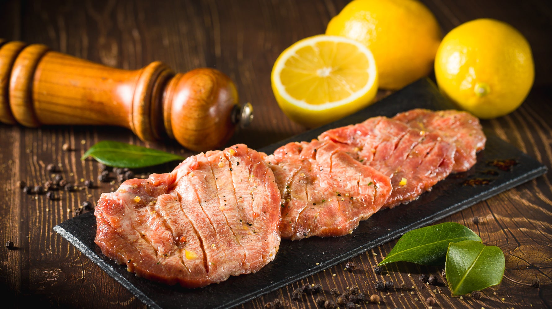 仙台グルメの定番【牛タン】丁寧にじっくりと熟成加工を施し、歯切れが良くなるようにスリット(切れ込み)を入れることで厚みがありながらもサクッと簡単に嚙み切ることが出来、かつジューシーで牛タンの旨味をしっかりと堪能することが出来ます。