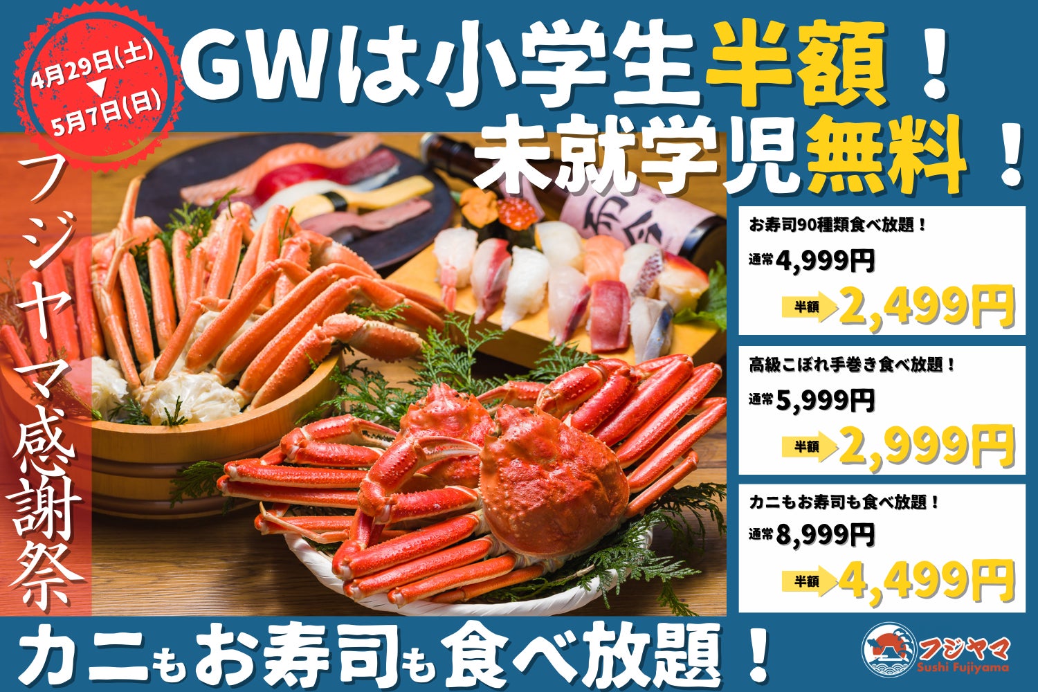 SNSやメディアで話題の”寿司食べ放題”が楽しめる『すし酒場 フジヤマ』秋葉原は、ゴールデンウィークの期間中、小学生のお子様限定で食べ放題プランを半額で提供いたします。日頃ご来店いただいているお客様に、ご家族とも利用してほしいという想いをこめた「フジヤマ感謝祭」のキャンペーンです。