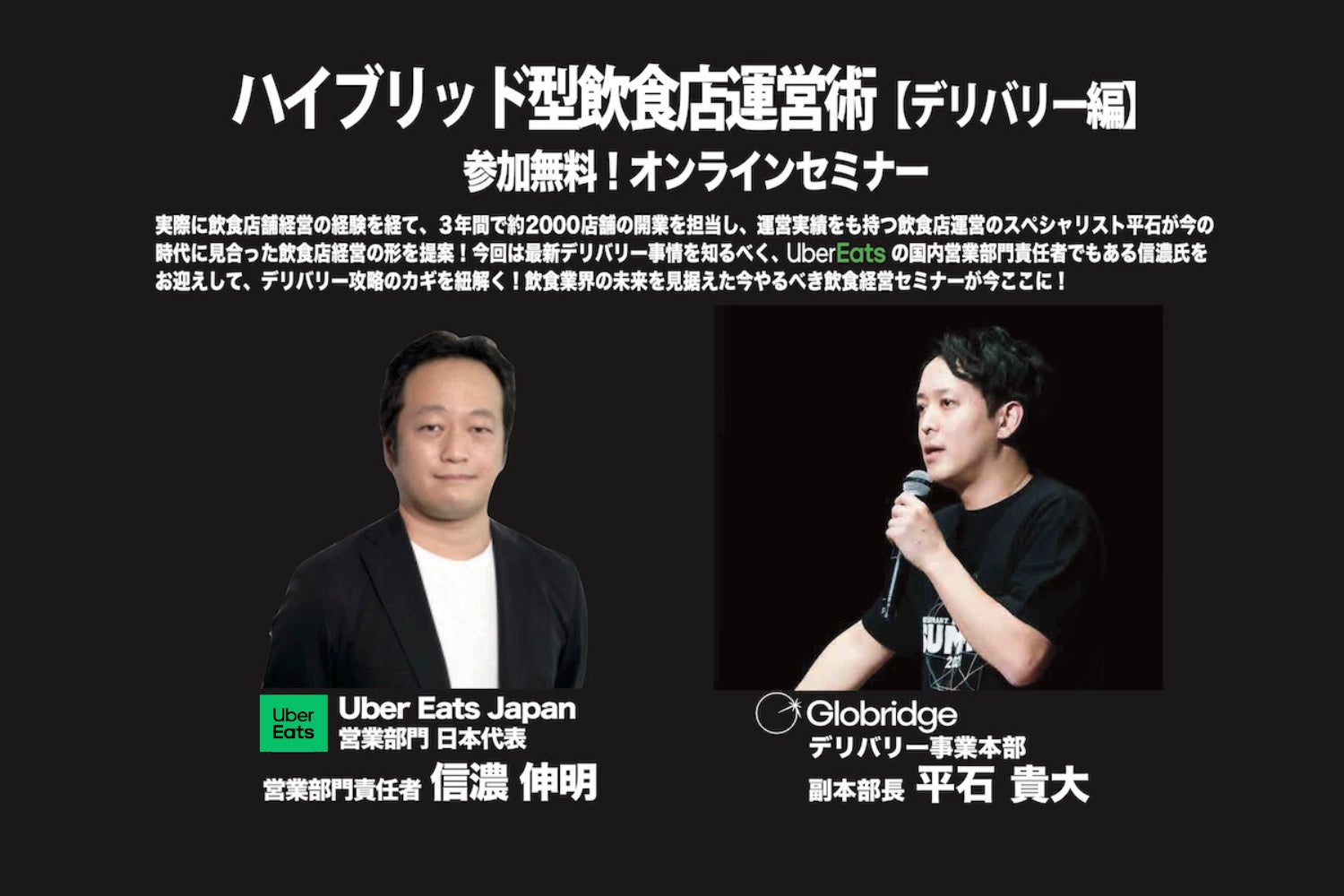 グロブリッジからは、デリバリー事業部・副本部長 平石貴大が登壇し、実際に飲食店店長を経験し、2,000店舗の開業を担当した本人だからこそわかる「デリバリー攻略のノウハウ」「時代に見合った飲食店の経営術」をお伝えいたします。