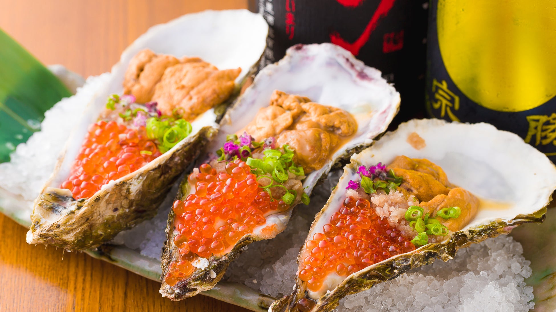 魚バカ一代の提供する、インパクト抜群の「背徳グルメ」は鍋だけではありません。生牡蠣にウニといくらを乗せた「痛風牡蠣」は、一年を通して人気の逸品です。使用する牡蠣は、その時期に一番美味しい品種を新鮮さを保った状態で仕入れているため、いつでも安心して生の状態でお召し上がりいただけます。