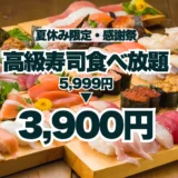 SNSやメディアで話題の”寿司食べ放題”が楽しめるFUJIYAMA TOKYO 大阪難波店では、2025年8月1日(金)~同年8月31日(日)の期間中、1日5組様限定で、通常5,999円(税込6,598円)の高級寿司食べ放題プランを、サンキュー価格の3,900円(税込)で提供いたします。